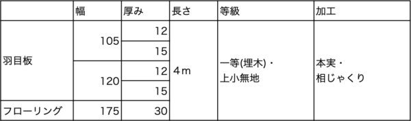 造作材とは、「羽目板」「フローリング」「鴨居」「天井板」「敷居」「長押」「階段」「窓枠」など家の内装の節のない仕上げ材の総称を指します。化粧材とも呼ばれます。
