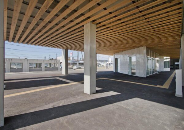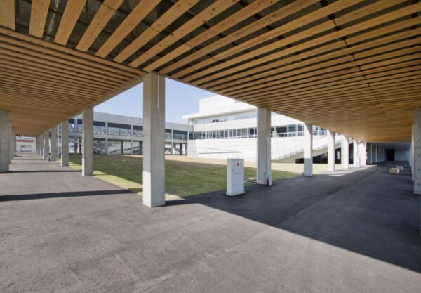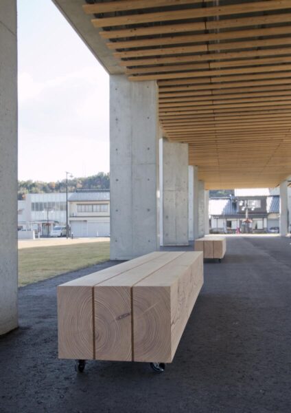 外部の回廊下には、大きな木材の角材を移動型ベンチが点在しており、誰もがひみ里山杉の温かみある色合いと質感に触れ合うことができます。