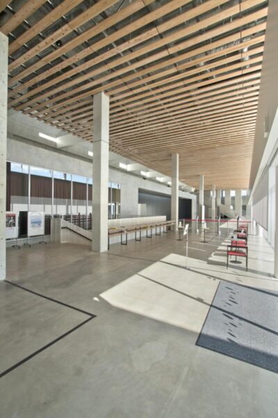 ひみ里山杉はホール2階エントランスの天井ルーバーと1階ピロティ(回廊下)の天井ルーバーに使われています。