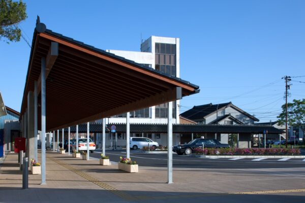 氷見駅周辺整備事業において氷見駅前にキャノピー(雨よけ)と駐車場、公共トイレが新設され、ひみ里山杉が使われています。